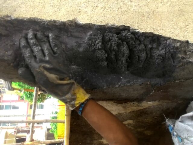 There are many cases where the steel corrodes due to various causes such as lack of cover, leakage of roofs & walls etc. One of the most common treatments for such structural strengthening is polymer mortar treatment. In this we remove all loose particles of mortar, concrete, rust, etc. from the spoiled surface and apply polymer modified mortar over the necessary surface as per the manufacturer’s specification.
